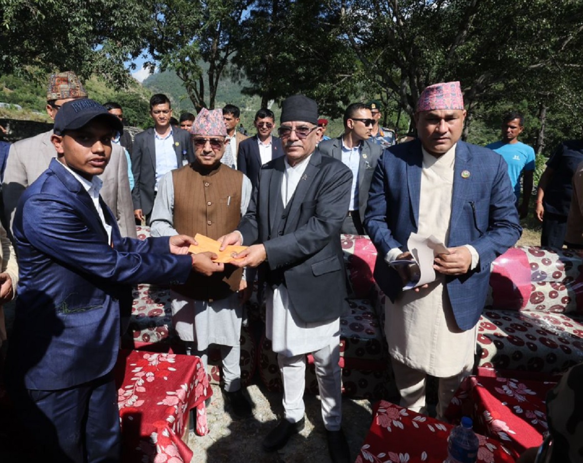 • काठमाडौँ  ,१९ असोज |  प्रधानमन्त्री पुष्पकमल दाहाल प्रचण्ड भूकम्प प्रभावितको स्थिति बुझ्न बझाङ आइपुगेका छन् । उनी नेपाली सेनाको हेलिकप्टरबाट बझाङको भोपुर ब्यारेकमा अवतरण गरेका छन् । प्रचण्डले भूकम्पले बढी क्षति गरेका स्थानको अवलोकन गर्ने र जिल्ला विपद व्यवस्थापन समितिसँग अन्तर्क्रिया गर्ने लगायत कार्यक्रम निर्धारण गरिएको छ । प्रधानमन्त्री दाहाल, उपप्रधानमन्त्रीहरू पूर्णबहादुर खड्का र नारायणकाजी श्रेष्ठ, परराष्ट्र मन्त्री एनपी साउद लगायतले शुक्रबार बझाङ पुगेर भूकम्पले क्षति पुर्‍याएका घरहरूको अवलोकन गरेका थिए।