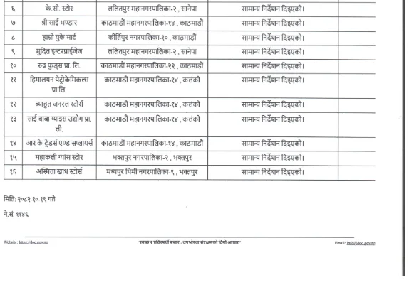 अनुगमनका क्रममा मध्यपुर थिमी नगरपालिका–७ भक्तपुरस्थित रमेश थापा स्टोरले उपभोक्ता संरक्षण ऐनको दफा १५ बमोजिम गर्नुपर्ने कार्य नगरेको पाइएको विभागले जनाएको छ। उक्त कसुरमा ऐनको दफा ३८ (घ) अनुसार दोषी ठहर गर्दै दफा ३९ (१)(क) बमोजिम १० हजार रुपैयाँ जरिवाना गरिएको छ।