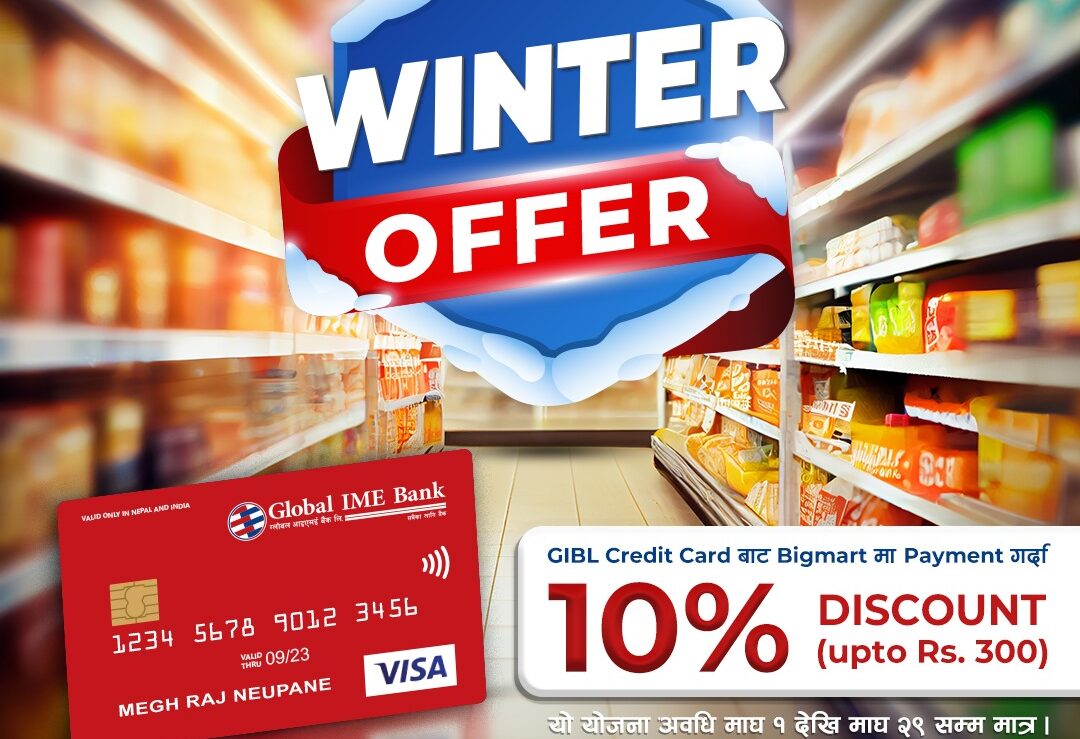 काठमाडौँ, २ माघ । ग्लोबल आइएमई बैंक लिमिटेडका क्रेडिट कार्ड बाहकहरुले बिगमार्टमा खरिद गरी बैंकको क्रेडिट कार्ड मार्फत भुक्तानी गर्दा खरिद मुल्यमा १०% छुट पाउनेछन् । बैंकको क्रेडिट कार्ड बाहकहरुलाई लावान्भित गर्ने गरी बैंकले बिगमार्टसँगको सहकार्यमा ल्याएको यस योजनामा ग्राहकहरुले बिगमार्ट स्टोरमा ग्लोबल आइएमई बैंकको क्रेडिट कार्डबाट भुक्तानी गर्दा १०% वा अधिकतम ३०० सम्म छुट पाउनेछन् ।