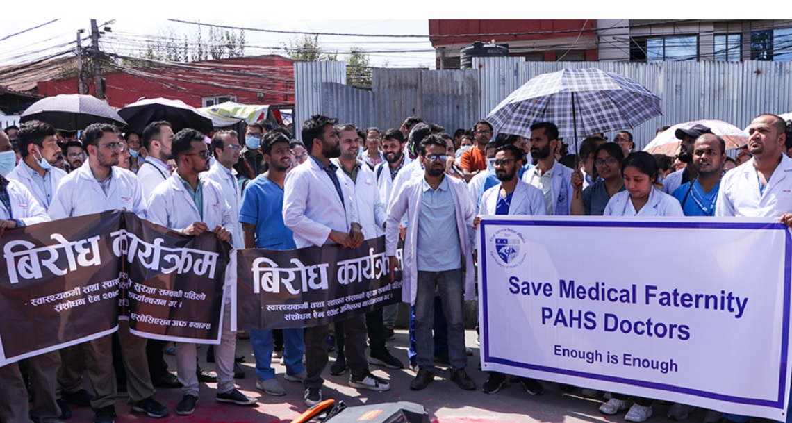 काठमाडौं, १० असोज । चिकित्सकमाथि बारम्बार आक्रमण भएको भन्दै चिकित्सकहरू आन्दोलित भएका छन् । मणिपाल शिक्षण अस्पताल लगायतका स्थानमा चिकित्सकमाथि भएका आक्रमणको विरोध गर्दै चिकित्सकहरूले बुधवार माइतीघर मण्डलामा विरोध प्रदर्शन गरेका हुन् । स्वास्थ्यकर्मीमाथि शृङ्खलाबद्ध आक्रमण हुन थालेपछि सुरक्षाको माग गर्दै चिकित्सकहरू सडकमा उत्रिएर विरोध जनाएका हुन् । स्वास्थ्यकर्मीहरूले स्वास्थ्यकर्मी तथा स्वास्थ्य संस्थाको सुरक्षासम्बन्धी पहिलो संशोधन ऐन, २०७९ अविलम्ब कार्यान्वयनको माग राखेका छन् ।