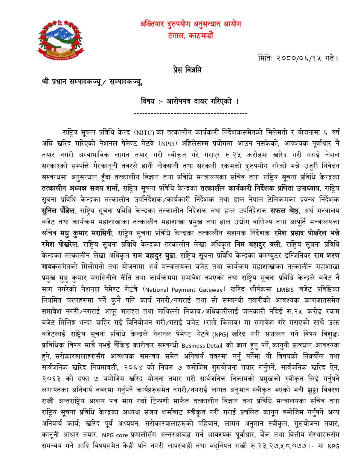 आयोगले उद्योग मन्त्रालयका सचिव मधुकुमार मरासिनीसहित नेपाल टेलिकमका प्रबन्ध निर्देशक सुनिल पौडेल, पूर्वसचिव एवम् राष्ट्रिय सूचना प्रविधि केन्द्र (एनआईटीसी)का तत्कालीन अध्यक्ष सञ्जय शर्मा, तत्कालीन कार्यकारी निर्देशक प्रणिता उपाध्यायसहित ९ जनाविरुद्ध विशेष अदालतमा मुद्दा दायर गरेको हो ।