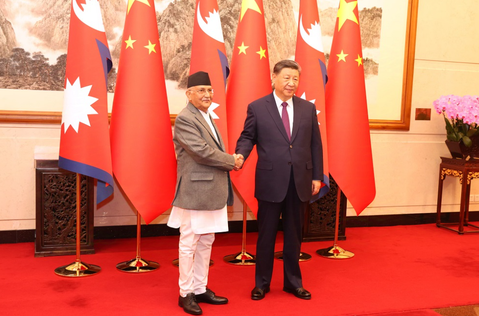 काठमाडौँ , मङ्सिर १८ गते । प्रधानमन्त्री केपी शर्मा ओली र चिनियाँ राष्ट्रपति सी जिनपिङबीच बेइजिङमा भेटवार्ता भएको छ। चीनको औपचारिक भ्रमणमा रहेका प्रधानमन्त्री ओलीले केहीबेर अघि राष्ट्रपति सीसँग बेइजिङको देउताइ स्टेट गेस्ट हाउसको भिल्ला नम्बर १२ मा भेट गर्नुभयो। यसअघि, प्रधानमन्त्री ओलीले चिनियाँ प्रधानमन्त्री ली छ्याङसँग पनि भेटवार्ता गरेका छन्।