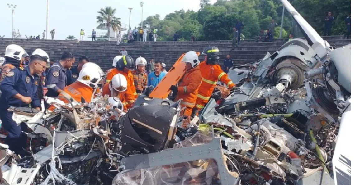 एजेन्सी | रोयल मलेशियन नौसेना परेडको लागि सैन्य पूर्वाभ्यासका क्रममा दुई नौसेना हेलिकप्टर बीच हावामा ठोक्किएपछि १० जनाको मृत्यु भएको छ। दुईवटा हेलिकप्टर जमिनमा ठोक्कनु अघि एउटा हेलिकप्टरले अर्कोको रोटर काटेको फुटेज स्थानीय मिडियामा प्रकाशित भइरहेको छ।