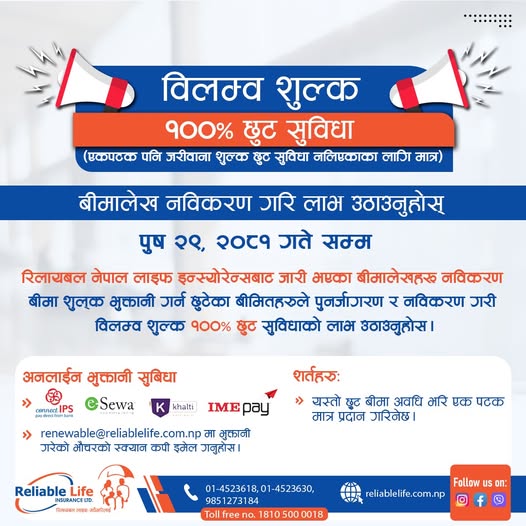विलम्ब शुल्कमा १००% छुट: रिलायबल नेपाल लाइफ इन्स्योरेन्सको विशेष योजना