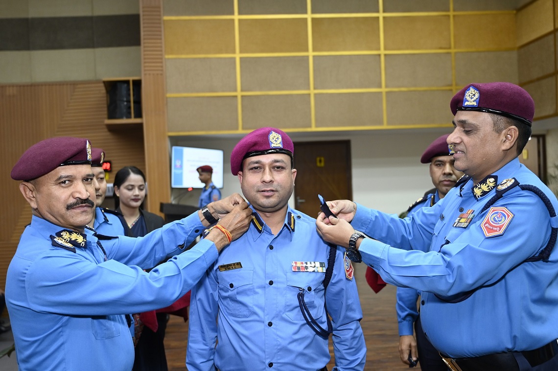 काठमाडौं , ८ जेठ | नेपाल सरकार गृह मन्त्रालय (सचिवस्तर)को २०८० जेठ ५ गतेको निर्णयले प्रहरी नायव उपरीक्षकबाट प्रहरी उपरीक्षक पदमा पदोन्नति भएका २२ जनामध्ये २१ जना प्रहरी अधिकृतहरू दर्ज्यानी चिन्हद्वारा सुशोभित हुनुभएको छ ।