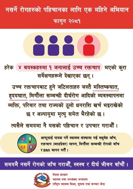 काठमाडौं, फागुन २०८१ – नसर्ने रोगहरूको पहिचानका लागि एक महिने विशेष अभियान सञ्चालन गरिएको छ। अध्ययनहरू अनुसार, हरेक चार वयस्कमध्ये एक जनालाई उच्च रक्तचाप भएको देखिएको छ। यसबाट मस्तिष्कघात, हृदयघात, मिर्गौला सम्बन्धी दीर्घरोगजस्ता जटिलताहरूको जोखिम बढ्दै गएको छ, जसको उपचारमा व्यक्ति, परिवार तथा राज्यले ठूलो आर्थिक भार व्यहोर्नु परेको छ।