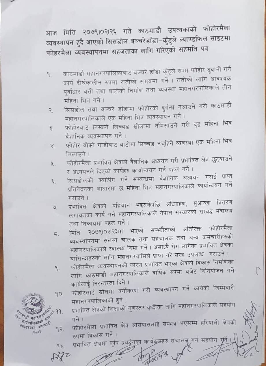 दुई पक्षबिच फोहोर ढुवानी रातिको समयमा गर्ने, रातिको लागि आवश्यक पूर्वाधार बत्ती तथा बाटोको निर्माण तीन महिनाभित्र गर्ने, सिसडोल र बञ्चरे डाँडामा फोहोरको दुर्गन्ध नआउने गरी काठमाडौं महानगरपालिकाले एक महिनाभित्र व्यवस्थापन गर्ने, सहरी विकास मन्त्रालयमा भएको प्रतिबद्धताको कार्यान्वयन गर्न पहल गर्ने लगायत १८ बुँदे सहमति भएको छ।