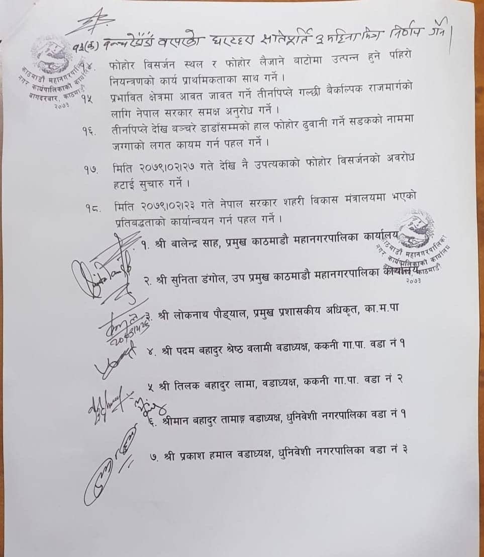 महानगर र सिसडोल बञ्चरेडाँडा बिच १८ बुँदे सहमति, फोहोर ढुवानी राति गर्नै(सम्झौताको पूर्णपाठ)