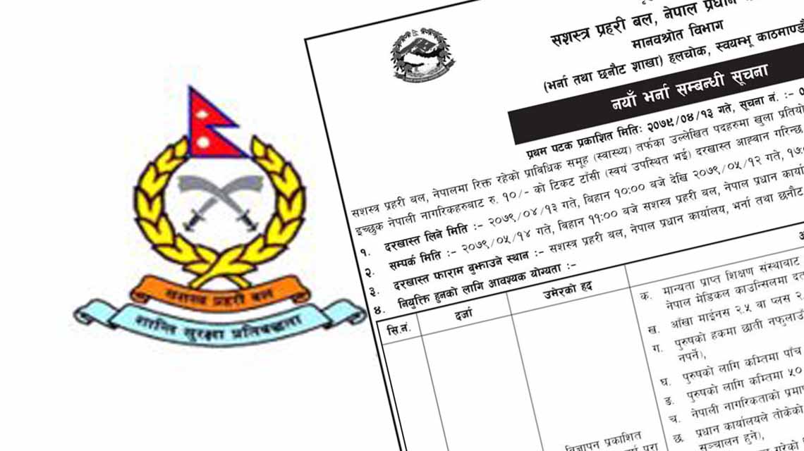 दरखास्त साउन १३ गतेदेखि भदौ १४ गतेसम्म सशस्त्र प्रहरी प्रधान कार्यालय भर्ना तथा छनौट शाखा हलचोकमा बुझाउन सक्नेछन् ।