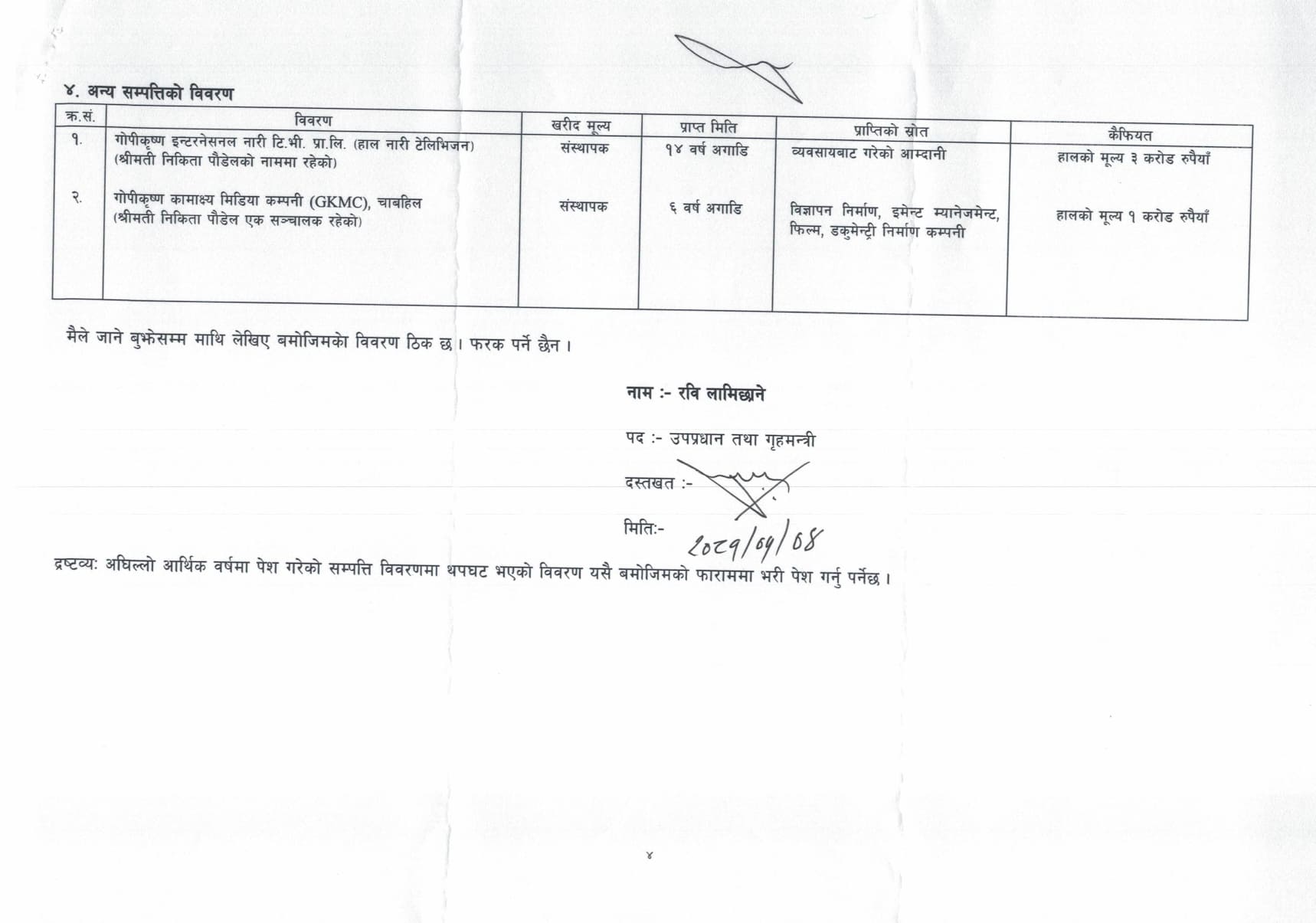 गृहमन्त्री रविको सम्पत्ति विवरण : पैतृक सम्पत्तिबाट प्राप्त १ रोपनी जग्गाबाहेक अरु सबै पत्नी निकिताको नाममा
