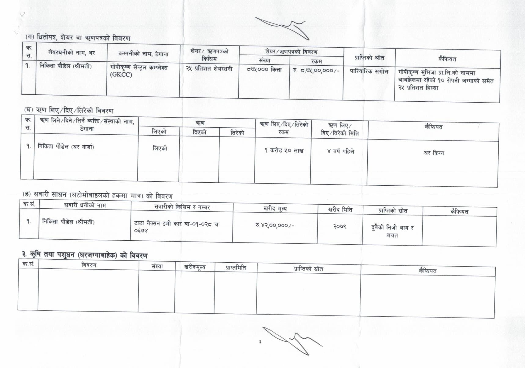 यस्तै श्रीमती निकिता पौडेलको माइतीको सगोलमा १० रोपनी जग्गा, ८० तोला सुन, २० केजी चाँदी, गोपिकृष्ण सेन्ट्रल कम्प्लेक्समा २५ प्रतिशत शेयर रहेको उल्लेख गरेका छन् ।