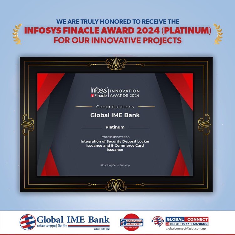 ग्लोबल आइएमई बैंक इन्फोसिस फिनाकल प्रोसेस इनोभेसन अवार्डद्वारा सम्मानित