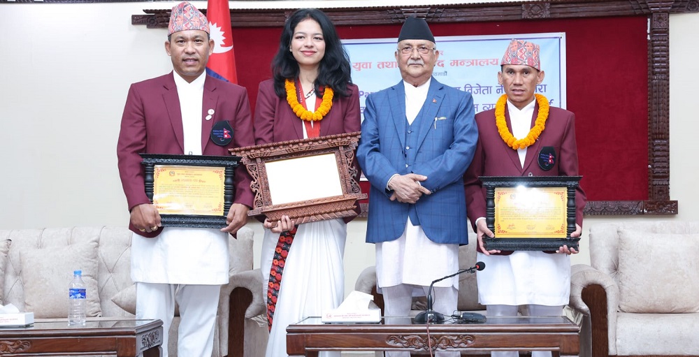 • काठमाडौँ , २८ भदौ । प्रधानमन्त्री केपी शर्मा ओलीले पेरिस पारा ओलम्पिक, २०२४ मा काँस्य पदक विजेता पलेसा गोवर्द्धनसहित प्रशिक्षक र टिम व्यवस्थापकलाई सम्मान गरेका थिए । शुक्रबार प्रधानमन्त्री निवास बालुवाटारमा कार्यक्रम आयोजना गरिएको थियो।