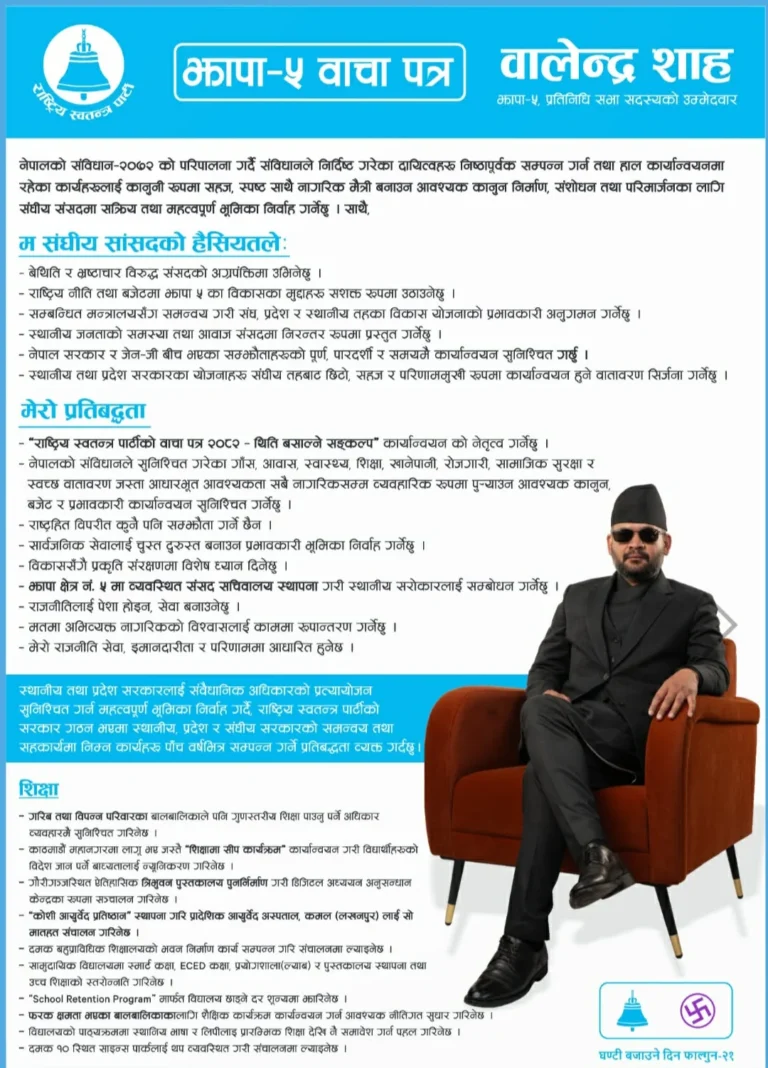 काठमाडौं । फागुन २१ गते हुने प्रतिनिधि सभा सदस्य निर्वाचनका लागि झापा–३ मा राष्ट्रिय स्वतन्त्र पार्टीका उम्मेदवार बालेन शाहले आफ्नो घोषणापत्र सार्वजनिक गरेका छन् ।