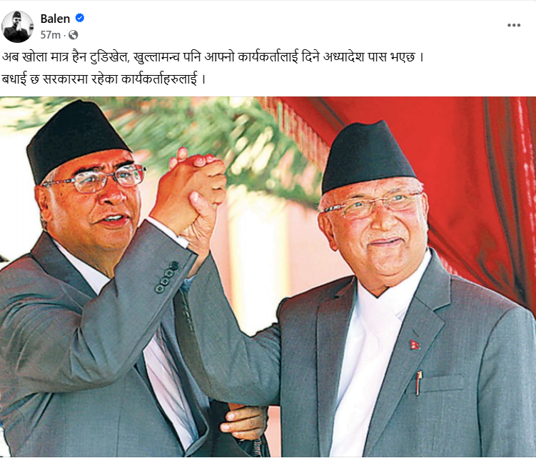 बालेन्द्र साहले संघीय सरकारलाई ब्यंग्य गरेका छन् । बुधबार सामाजिक सञ्जालमा अभिव्यक्ति सार्वजनिक गर्दै मेयर बालेन संघीय सरकारको आलोचना गरेका हुन् । मेयर शाहले आफ्नो फेसबुकमार्फत लेखेका छन्, ‘अब खोला मात्र हैन टुँडिखेल, खुलामञ्च पनि आफ्नो कार्यकर्तालाई दिने अध्यादेश पास भएछ । बधाई छ सरकारमा रहेका कार्यकर्ताहरुलाई ।’