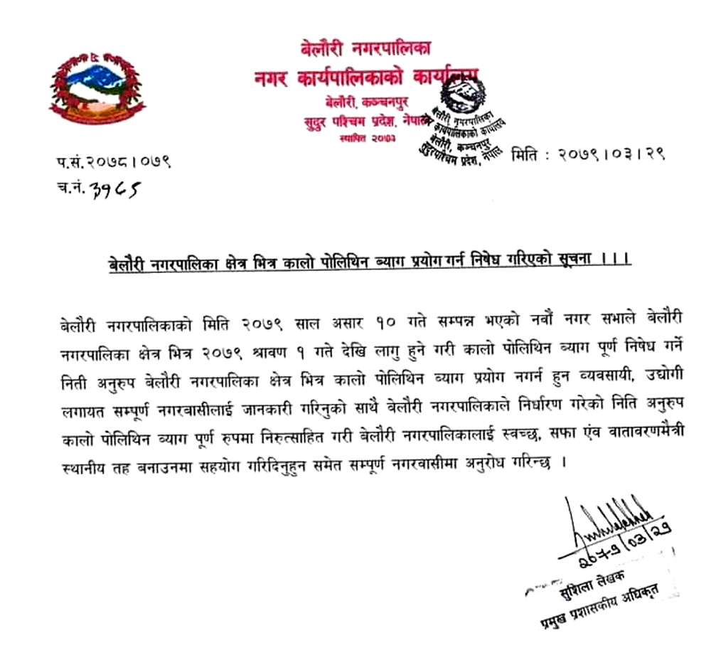 कञ्चनपुर, ३० असार । कञ्चनपुर जिल्लाको बेलौरी नगरपालिकाले कालो प्लास्टिक (पोलिथिन) झोला प्रयोग गर्न प्रतिबन्ध लगाएको छ ।