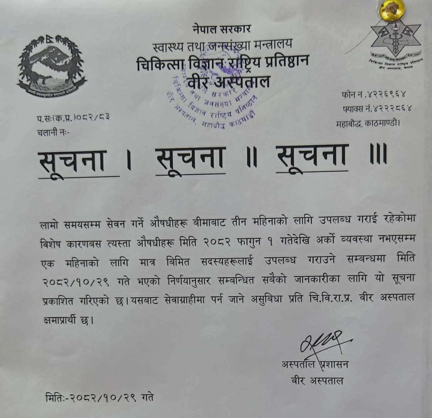 अस्पतालका अनुसार यो नयाँ व्यवस्था १ फागुनदेखि लागू हुनेछ। सूचनामा भनिएको छ, “१ फागुनदेखि अर्को व्यवस्था नभएसम्म बिमित सदस्यलाई एक महिनाका लागि मात्र औषधि दिइनेछ।”