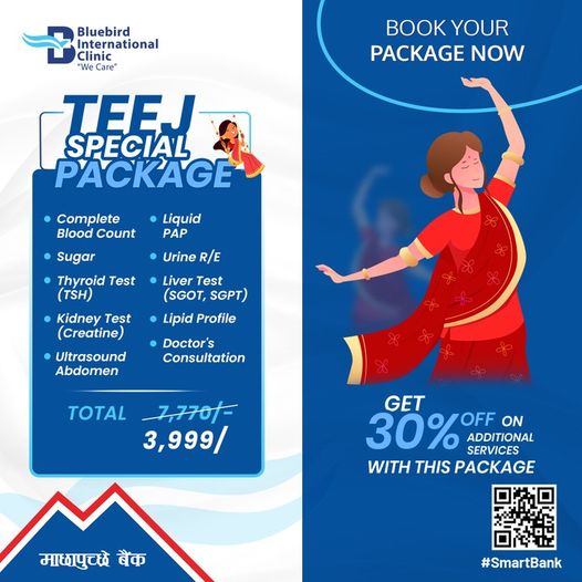 • काठमाडौं ।माछापुच्छे् बैकका ग्राहकहरूको लागि ब्लुबर्ड इन्टरनेशलन क्लिनिकले ‘तिज विशेष प्याकेज’ सार्वजनिक गरेको छ। यो विशेष प्रस्ताव अन्तर्गत,माछापुच्छे« बैकका ग्राहकहरूले मात्र पूर्ण शरीर जाँच (Full Body Checkup) अब रु. ३,९९९/- मा प्राप्त गर्न सक्नेछन्। यो प्याकेजले समग्र स्वास्थ्यको विस्तृत मूल्याङ्कन गर्न र प्रारम्भिक चरणमा स्वास्थ्य समस्याहरूलाई पत्ता लगाउन मद्दत पुर्याउँछ।