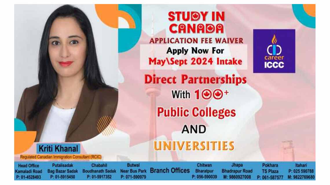 पछिल्लो समय अध्ययन भिसा पाउने दर बढेसङै क्यानडा जाने विद्यार्थीहरुको संख्या बढेको छ । इन्टरनेशनल करियर काउन्सिलिङ सेन्टर (ICCC) एक प्रतिष्ठित र गतिशील शैक्षिक परामर्श संस्था हो, जसले बिगत लामो समयदेखी अन्तर्राष्ट्रिय शिक्षा हासिल् गर्न ईच्छुक विद्यार्थीहरूलाई लागि बिशेष गरी क्यानडाका उत्कृष्ट विश्वविद्यालय र कलेजहरू सँग सम्बन्ध स्थापनागरी क्यानाडाको शैक्षिक अवसरको बारेमा परामर्श प्रदान गर्दै आइरहेको छ ।