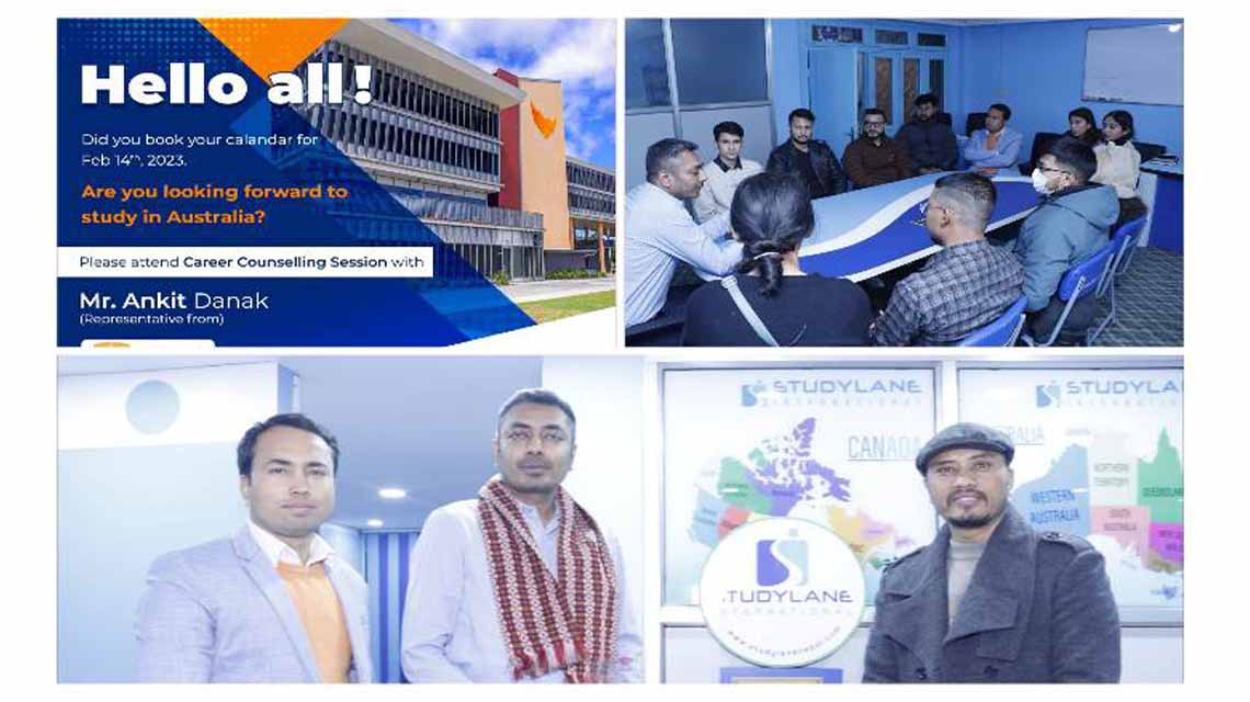 काठमाडौंको ३ फागुन |-स्टडीलेन इन्टरनेशनलले अष्ट्रेलियामा अध्ययन गर्न चाहने विद्यार्थीहरूलाई केन्द्रित गर्दै पुतलीसडक (माछापुच्छ्रे बैंक नजिकै, शंकरदेव क्याम्पसको अगाडि) स्थित आफ्नै कार्यालयमा १४ फेब्रुअरी २०२३, मंगलबार एक करियर काउन्सिलिङ सेसनको आयोजना गरेको छ ।