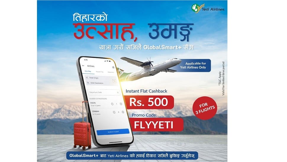 बैंकका ग्राहकहरु तथा ग्राहक परिवारका सदस्यहरुले ग्लोबल स्मार्ट प्लसबाट यती एयरलाइन्सको टिकट बुक गर्दा/काट्दा “FLYYETI” प्रोमो कोड प्रयोग गरी रु. ५०० क्यासब्याक पाउनेछन । ग्राहकहरुले यो प्रोमो कोड ३ पटकसम्म प्रयोग गर्न सक्नेछन । यो क्यासब्याक योजना नोभेम्बर २९ सम्म रहने छ ।