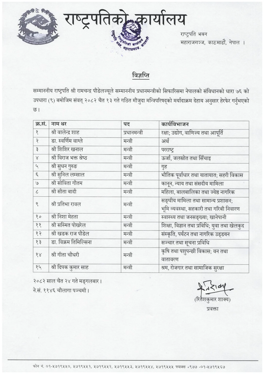 काठमाडौं । बालेन्द्र शाह नेतृत्वको मन्त्रिपरिषद्मा मन्त्रीहरूको वरीयता (कुन मन्त्री कति माथि वा तल भन्ने क्रम) परिवर्तन गरिएको छ। प्रधानमन्त्रीको सिफारिसमा राष्ट्रपति रामचन्द्र पौडेलले यो हेरफेर गरेका हुन्।