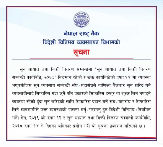 सुन खरिदका लागि वाणिज्य बैंकमार्फत सिफारिस गरिने प्रक्रियामा व्यवसायीहरूबाट शुल्क लिने कार्य गैरकानुनी भएको भन्दै राष्ट्र बैंकले उक्त व्यवस्था पालन गर्न सम्बन्धित संघ/महासंघ र व्यवसायीहरूलाई आग्रह गरेको छ।