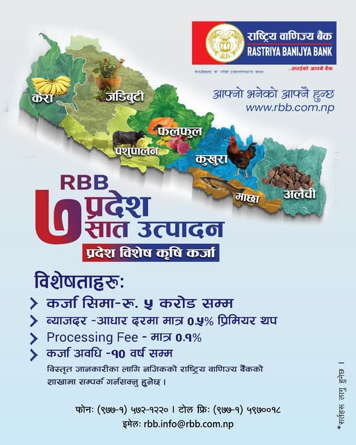 काठमाडौं, । राष्ट्रिय वाणिज्य बैंकले देशभरका कृषि उद्यम तथा किसानलाई लक्षित गर्दै ‘७ प्रदेश, ७ उत्पादन’ नामक विशेष कृषि कर्जा योजना सञ्चालन लागु गदै आएको छ।