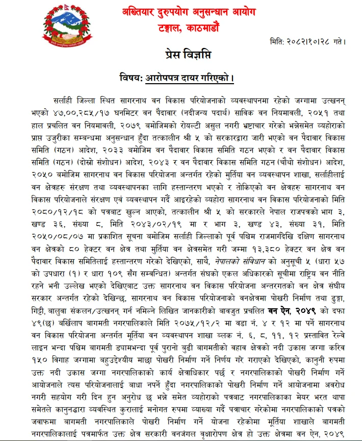• काठमाडौँ — अख्तियार दुरुपयोग अनुसन्धान आयोगले सर्लाहीस्थित सागरनाथ वन विकास परियोजनामा भएको ठूलाे राजस्व चुहावट प्रकरणमा तत्कालीन परियोजना प्रमुख तथा बागमती नगरपालिकाका नगर प्रमुखसहित १३ जनाविरुद्ध भ्रष्टाचार मुद्दा दायर गरेको छ। आयोगले राजस्व चुहावट गरी भ्रष्टाचार गरेको अभियोगमा उनीहरूविरुद्ध विशेष अदालतमा मुद्दा दायर गरेको जनाएको छ।