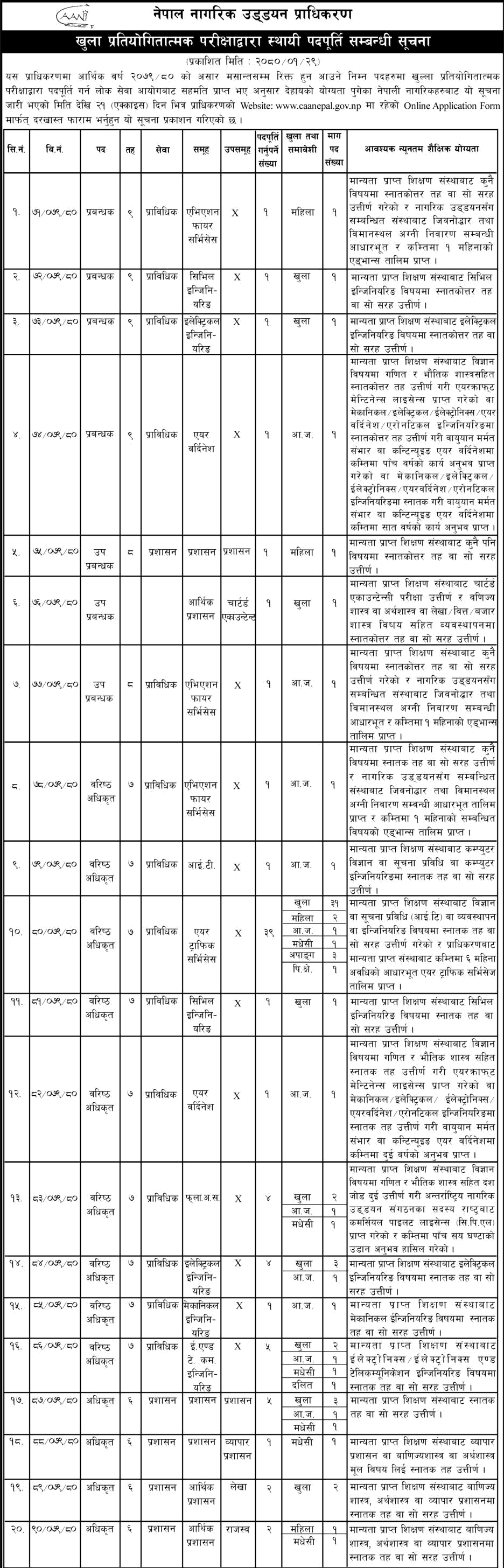 रिक्त पदहरूमा आवेदन दिन इच्छुक उम्मेदवारहरूले नेपाल नागरिक उड्डयन प्राधिकरणको आधिकारिक वेबसाइट www.caanepal.gov.np मा उपलब्ध अनलाइन मार्फत आवेदन फारम भर्नुपर्नेछ। आवेदन सूचना जारी भएको मितिबाट २१ दिनभित्र दिनु पर्नेछ ।