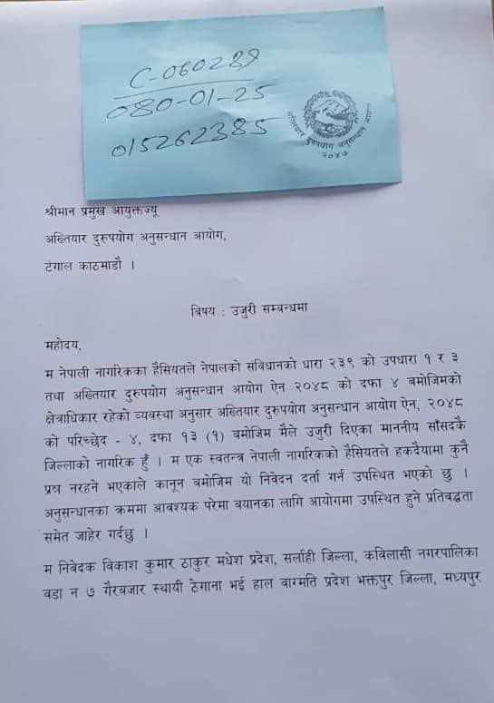 सिंहविरुद्ध उनकै गृहजिल्लाबासी विकाशकुमार ठाकुरले सोमवार अख्तियारमा उजुरी दिएका छन् ।