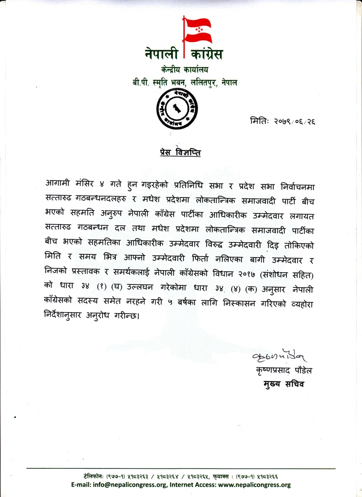 पार्टी मुख्यालयका मुख्यसचिव कृष्णप्रसाद पौडेलले एक विज्ञप्ति जारी गर्दै गठबन्धनको आधिकारिक उम्मेदवार विरुद्ध उम्मेदवारी दिएका उम्मेदवार र निजको प्रस्तावक तथा समर्थकलाई निस्कासन गरिएको उल्लेख छ।