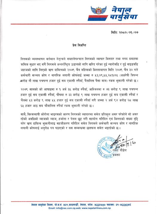 निगमले कर्मचारी सञ्चय कोष र नागरिक लगानी कोषबाट जहाज किन्न लिएको २ अर्ब ९४ करोड २८ लाख रुपैयाँ ऋणको सावाँ ब्याज भुक्तानी गरेको हो ।