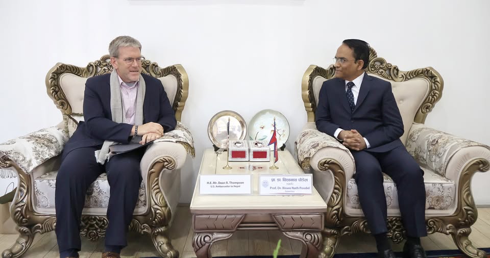 काठमाडौं । नेपालका लागि संयुक्त राज्य अमेरिकाका राजदूत महामहिम डिन आर. थम्पसनले आज नेपाल राष्ट्र बैंकका गभर्नर प्रा. डा. विश्वनाथ पौडेलसँग शिष्टाचार भेट गर्नुभएको छ।