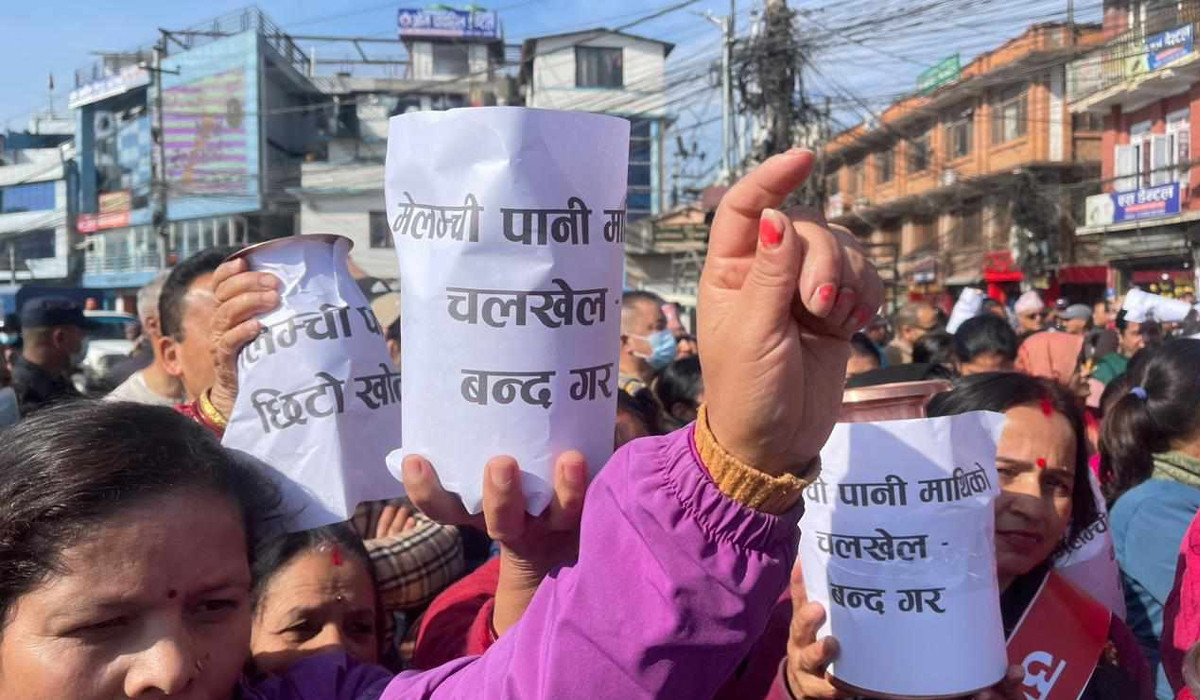 मेलम्चीको पानी काठमाडौँमा नियमित वितरण गर्न माग गर्दै प्रदर्शन गरेको प्रदेश सांसद समेत रहेका सुनिल केसीले जानकारी दिए । प्रदर्शनकारीले ‘मेलम्चीको पानी माथिको चलखेल बन्द गर्नुपर्ने, मेलम्चीको पानी तत्काल वितरण गर्नुपर्ने लगायतका प्लेकार्ड बोकेका थिए ।