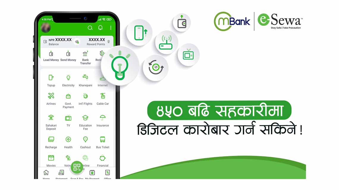 इसेवासँगको सहकार्यसँगै अबदेखि एम बैंकमार्फत सहकारीबाट बैंकमा रकम ट्रान्स्फर, इसेवा वालेटमा रकम लोड, क्यूआर भुक्तानी, सबै किसिमको युटिलिटी पेमेन्ट, सेयर खरिदको भुक्तानी, मेरो सेयर÷डिम्याट नविकरण, राजस्व, ट्राफिक जरिवाना भुक्तानी लगायतका सेवा उपयोग गर्न पाइनेछ । हाल स्क्यान एण्ड पे सेवाको सुरूवात भइसकेको छ भने अन्य सेवा निकट भविष्यमै उपलब्ध हुनेछन् ।