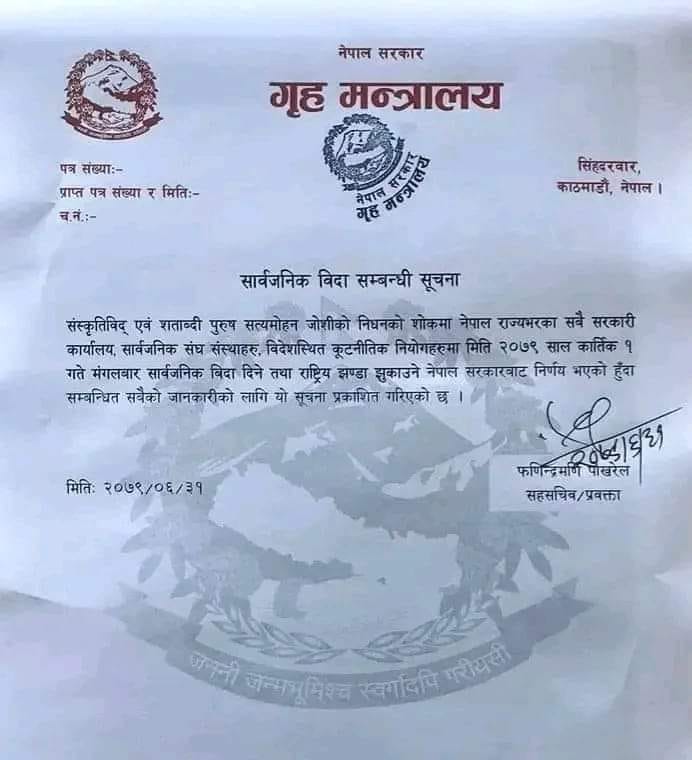 भैरहवा, ३१ असोज। सरकारले वाङ्मय शताब्दी पुरुष सत्यमोहन जोशीको निधनको शोकमा भाेलि मङ्गलवार सार्वजनिक बिदा दिएको छ ।