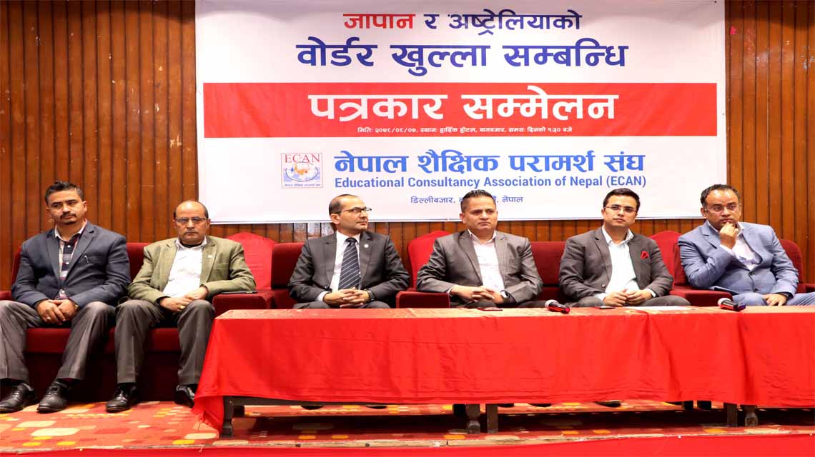 नेपाल शैक्षिक परामर्श संघ (ईक्यान) ले जापान र अस्ट्रेलियाको बोर्डर खुल्ला सम्बन्धी पत्रकार सम्मेलन सम्पन्न गरेको छ । मंगलबार राजधानीको हार्दिक होटलमा आयोजित उक्त सम्मेलन कोरोनाका कारण बिथोलिएको शैक्षिक परामर्श व्यवसाय र यसको पछिल्लो अवस्थामा केन्द्रित थियो। केही दिन अघि मात्रै अस्ट्रेलिया सरकारले डिसेम्बर १ तारिखदेखि अन्तर्राष्ट्रिय बोर्डर खुला गर्ने निर्णय गरेको र जापान सरकारले यसअघि नै बोर्डर खोलिसकेकाले अब विदेश अध्ययन गर्न जाने तयारी गरिरहेकालाई सहजीकरण गर्न र व्यवसायलाई पुरानै लयमा फर्काउन व्यवसायीहरू तत्पर रहेको सन्देश इक्यानले दिएको छ।ईक्यानका सदस्य परामर्श व्यवसायीहरू, पुर्व पदाधिकारीहरू तथा पत्रकारहरूको उपस्थितिमा सम्पन्न कार्यक्रमको अध्यक्षता ईक्यान अध्यक्ष प्रकाश पाण्डेले गरेका थिए।