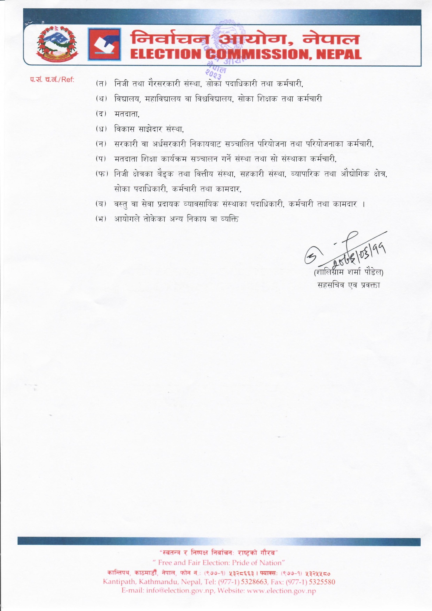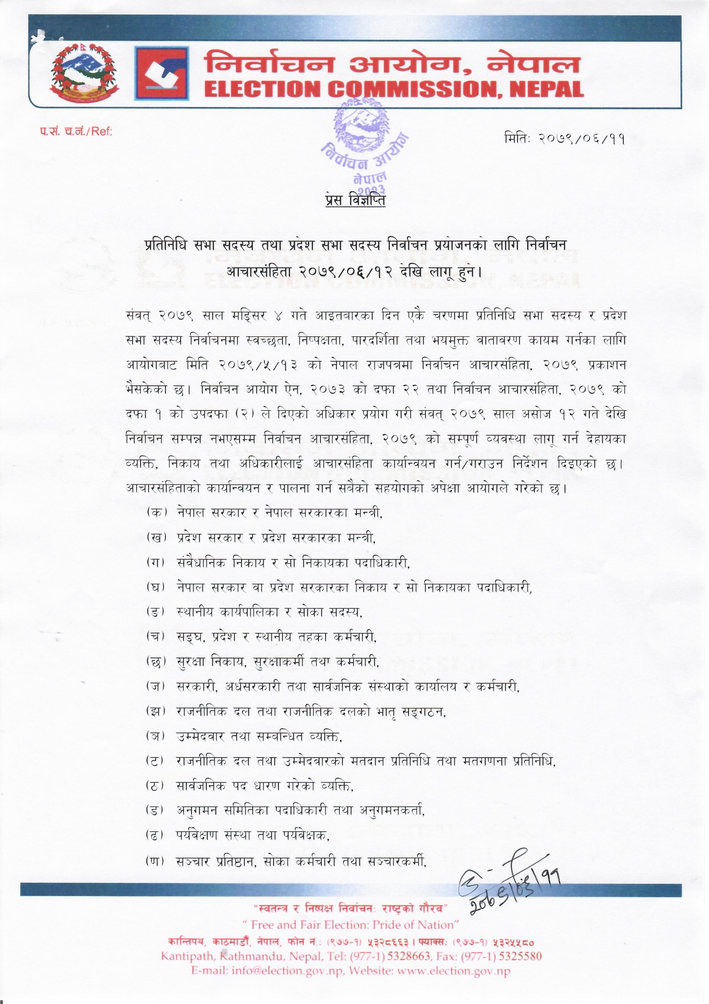 • काठमाडौँ, ११ असोज । निर्वाचन आयोगले आउँदो मङ्सिर ४ गते हुने प्रतिनिधि सभा र प्रदेश सभा निर्वाचनको लागी बुधबार (असोज १२) गते देखि निर्वाचन आचारसंहिता, २०७९ लागू गर्ने निर्णय गरेको छ ।