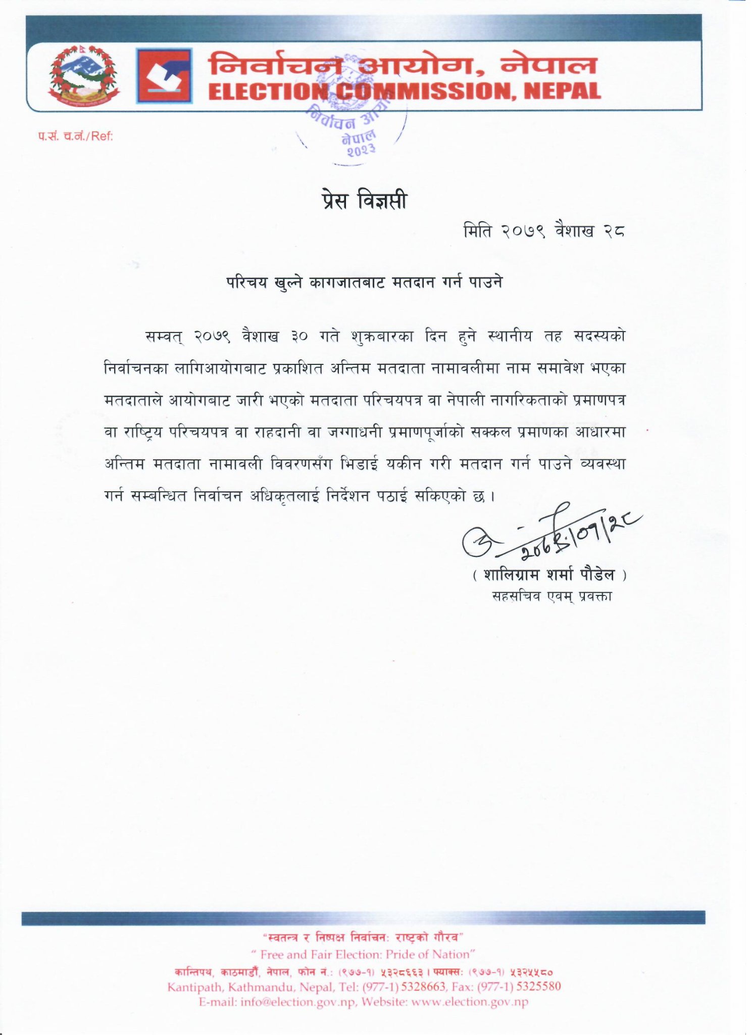 • काठमाडौं । निर्वाचन आयोगले भोलि वैशाख ३० गते हुने स्थानीय तह सदस्य निर्वाचन, २०७९ का लागि मतदाता नामावलीमा समावेश भएका मतदाताले मतदाता परिचयपत्र वा अन्य सक्कली सरकारी कागजपत्रका आधारमा मतदान गर्न सकिने निर्णय गरेको छ ।