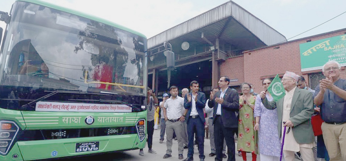 साझाका संस्थापक अध्यक्ष विश्वबन्धु थापाले उक्त विद्युतीय बसको हरियो झण्डा देखाएर शुभारम्भ गरे।
