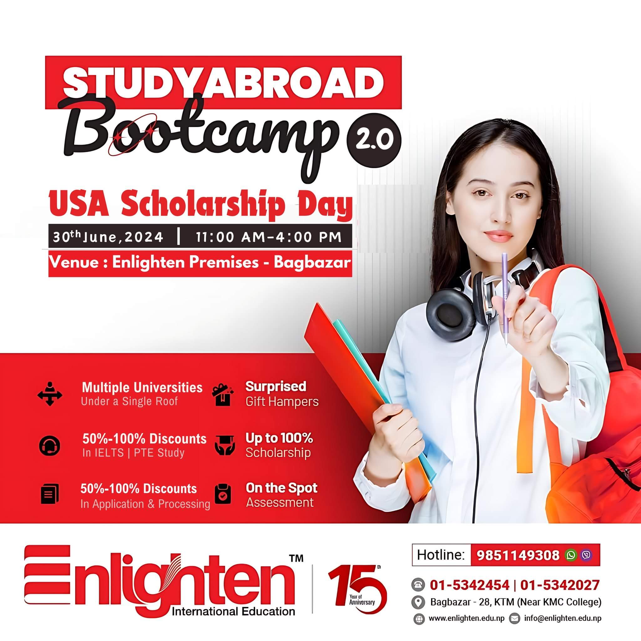 • काठमाडौँ, १२ असार ।एन्लाइटन इन्टरनेशनल एजुकेशनले २०२४ जुन ३० मा एन्लाइटन परिसरमा  बहुप्रतीक्षित स्टडी एब्रॉड बूटक्याम्प २.०: आयोजना हुने भएको छ।