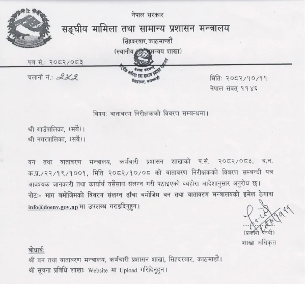 मुलुकभर वातावरण निरीक्षक विवरण संकलन गर्न प्रदेश–स्थानीय तहलाई पत्राचार