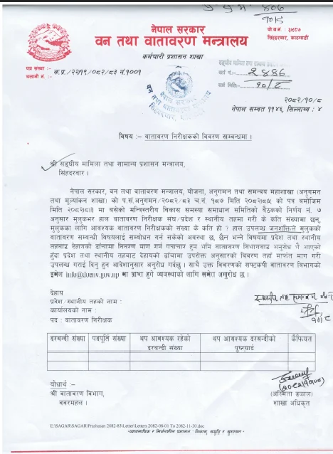 पत्रमा उल्लेख छ, मुलुकभर हाल वातावरण निरीक्षक संघ, प्रदेश र स्थानीय तहमा कति संख्या रहेका छन्, मुलुकका लागि आवश्यक निरीक्षकको संख्या कति छ, र उपलब्ध जनशक्तिले वातावरण सम्बन्धी कार्य समुचित रूपमा सञ्चालन गर्न सकिरहेको अवस्था छ कि छैन भन्ने विषयमा जानकारी माग गरिएको छ।