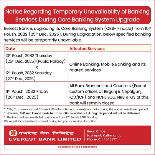 • काठमाडौं — एभरेष्ट बैंक लिमिटेडले आफ्नो कोर बैंकिङ सिस्टम (CBS-Finacle) अपग्रेड गर्ने भएको छ। आगामी १० पुस २०८२ देखि सुरु हुने यो अपग्रेडको अवधिमा बैंकका केही सेवा अस्थायी रूपमा अवरुद्ध रहनेछन्।