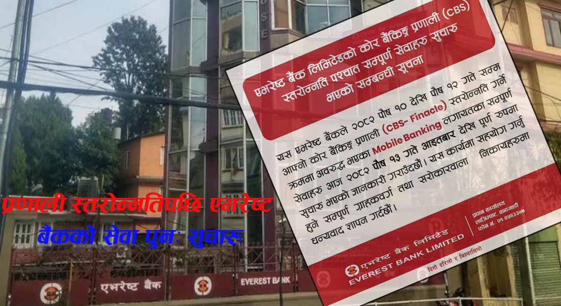 काठमाडौँ । एभरेष्ट बैंक लिमिटेडले आफ्नो कोर बैंकिङ प्रणाली स्तरोन्नति कार्य सफलतापूर्वक सम्पन्न भएपछि मोबाइल बैंकिङसहित बैंकका सम्पूर्ण सेवाहरू पूर्ण रूपमा सुचारु भएको जानकारी गराएको छ। बैंकले २०८२ साल पौष १० गतेदेखि पौष १२ गतेसम्म कोर बैंकिङ प्रणाली स्तरोन्नति गर्ने क्रममा केही सेवाहरू अस्थायी रूपमा अवरुद्ध भएका थिए।