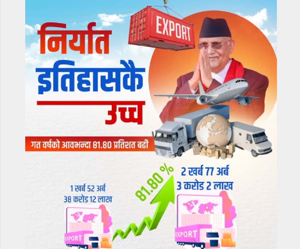 • काठमाडौँ – प्रधानमन्त्री केपी शर्मा ओलीले आर्थिक वर्ष २०८१|८२ मा नेपालले इतिहासमै सर्वाधिक निर्यात गर्न सफल भएको बताएका छन्। सामाजिक सञ्जालमार्फत प्रधानमन्त्री ओलीले नेपालले रु २ खर्ब ७७ अर्ब ३ करोड २ लाख बराबरको वस्तु तथा सेवा निर्यात गरेको जानकारी दिएका छन्।