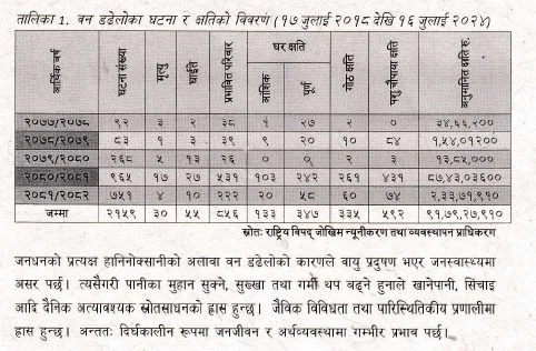 गृह मन्त्रालयबाट प्रकाशित नेपाल विपद् प्रतिवेदन, २०२४ का अनुसार पछिल्लो ६ वर्षको अवधिमा आगलागीका १९ हजार ५९३ घटना घटेका थिए भने आगलागीमा परी ५९३ जनाले ज्यान गुमाएका राष्ट्रिय विपद् जोखिम न्यूनीकरण तथा व्यवस्थापन प्राधिकरणको तथ्याङ्क अनुसार आ.ब. २०७७ । ७८ देखि आ.व. २०८१।८२ सम्मको वन डढेलोका घटना र वन डढेलोका घटना र तिनमा भएको क्षति तालिका 1 मा उल्लेख गरिएको थिए ।