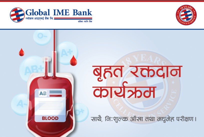 काठमाण्डौ। ग्लोबल आइएमई बैंक लिमिटेडले आफ्नो १८औँ वार्षिकोत्सवको अवसरमा वृहत रक्तदान कार्यक्रमको आयोजना गरेको छ । ग्लोबल आइएमई बैंक पौष १८ गते विहीबारदेखि स्थापनाको १८ वर्ष पुरा गरी १९ औँ वर्षमा प्रवेश गरेको छ ।