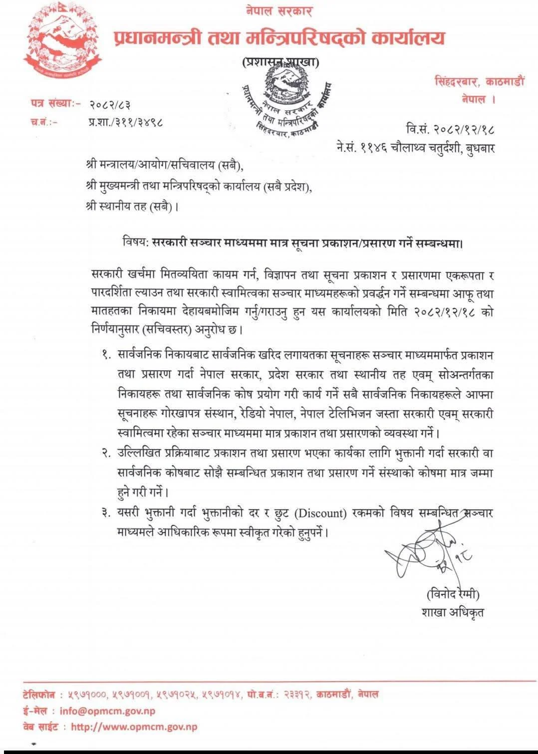 सरकारी विज्ञापन अब सरकारी मिडियामा मात्रै प्रकाशन गर्न निर्देशन ,निजी सञ्चार माध्यमहरूको विरोध